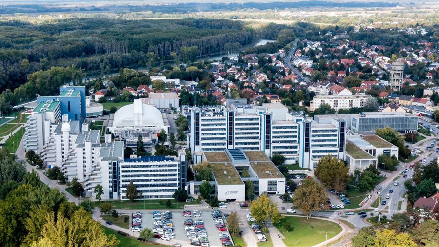 A Széchenyi-egyetem központi campusa Győr belvárosától öt perc sétára, a Mosoni-Duna közvetlen szomszédságában található. (Fotó: Ferencz Dániel/Széchenyi István Egyetem)